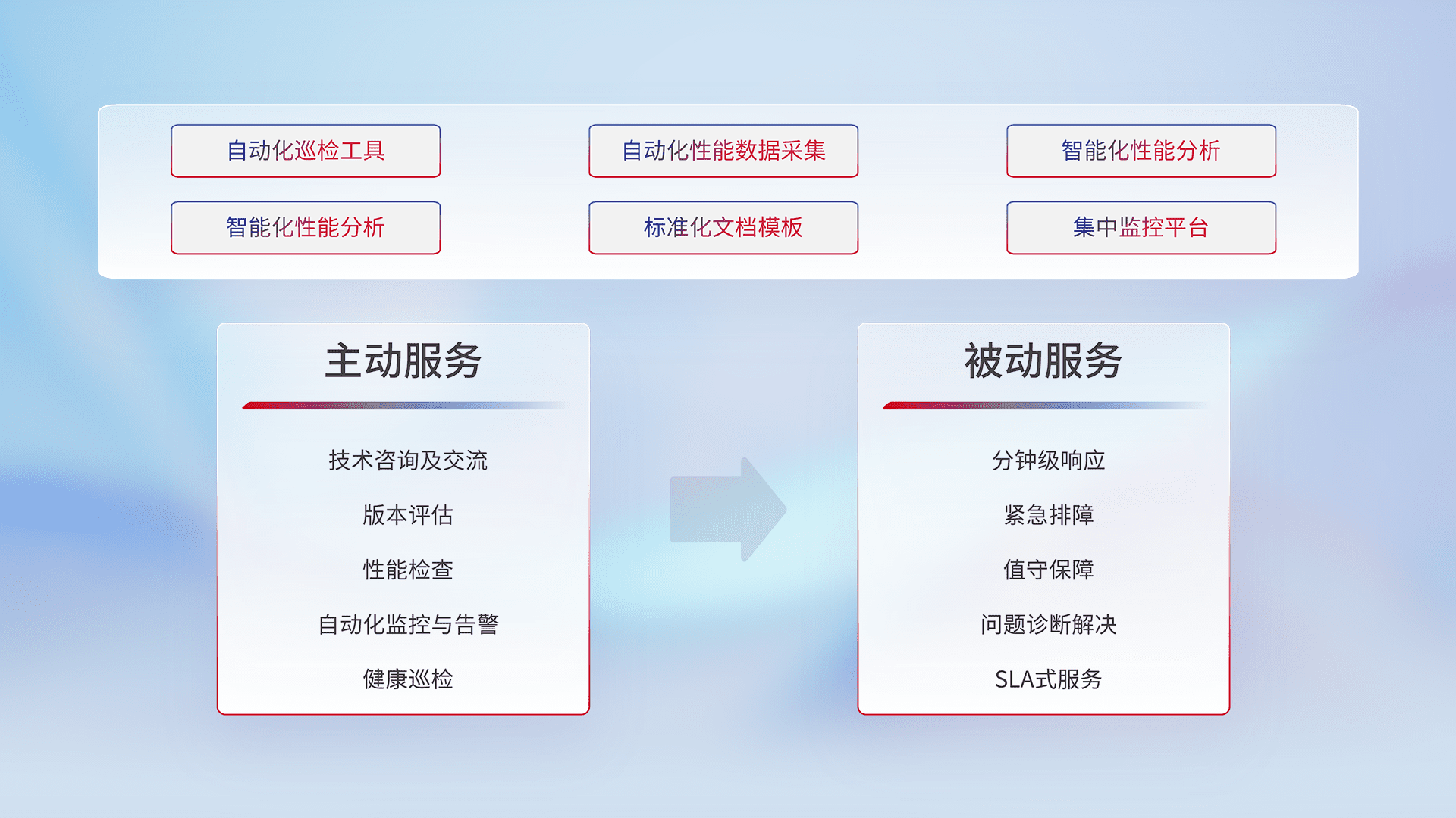 智能化工具和标准化文档,,,,保障服务质量,,,提供主动服务(包含技术咨询、、、、版本评估、、、、性能检查、、自动化监控与告警、、健康巡检)和被动服务包含(分钟级响应、、、、紧急排障、、、值守保障、、、、问题诊断解决、、、、SLA服务)。。。。